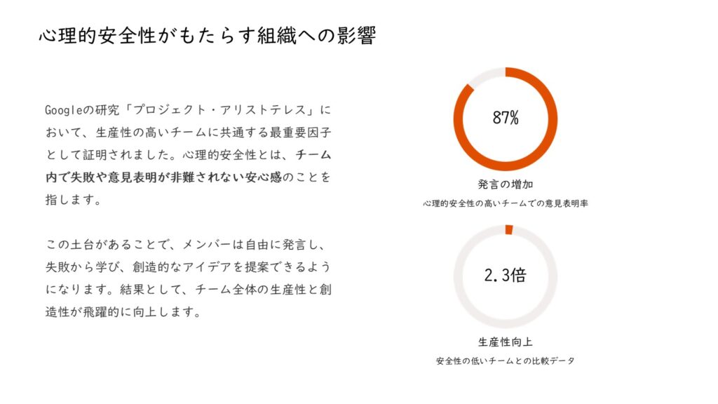 - 心理的安全性のある環境では、過去の経験を振り返り、学びを容易にします。